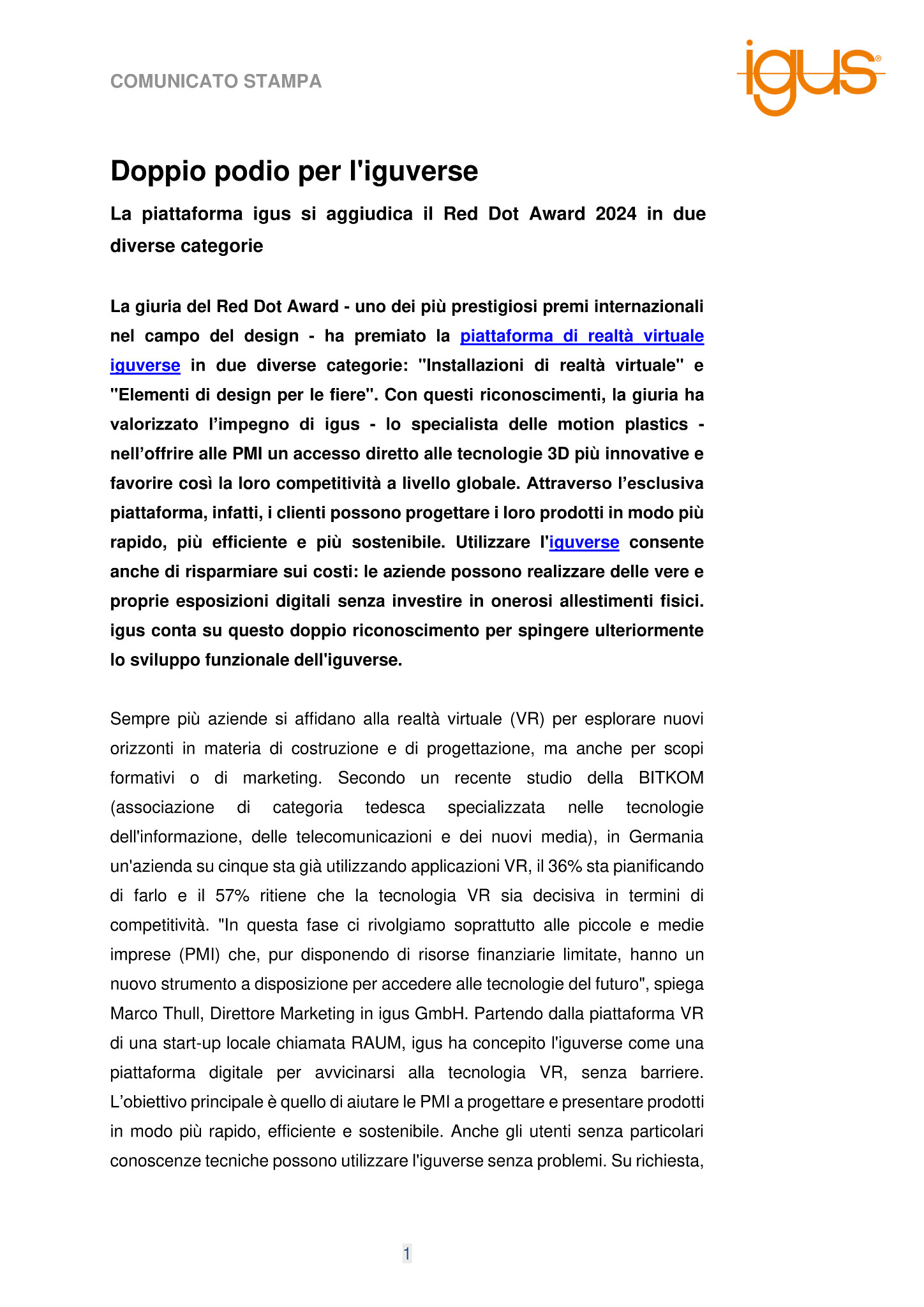 La giuria del Red Dot Award – uno dei più prestigiosi premi internazionali nel campo del design – ha premiato la piattaforma di realtà virtuale iguverse in due diverse categorie: “Installazioni di realtà virtuale” e “Elementi di design per le fiere”. Con questi riconoscimenti, la giuria ha valorizzato l’impegno di igus – lo specialista delle motion plastics – nell’offrire alle PMI un accesso diretto alle tecnologie 3D più innovative e favorire così la loro competitività a livello globale. Attraverso l’esclusiva piattaforma, infatti, i clienti possono progettare i loro prodotti in modo più rapido, più efficiente e più sostenibile. Utilizzare l’iguverse consente anche di risparmiare sui costi: le aziende possono realizzare delle vere e proprie esposizioni digitali senza investire in onerosi allestimenti fisici. igus conta su questo doppio riconoscimento per spingere ulteriormente lo sviluppo funzionale dell’iguverse.