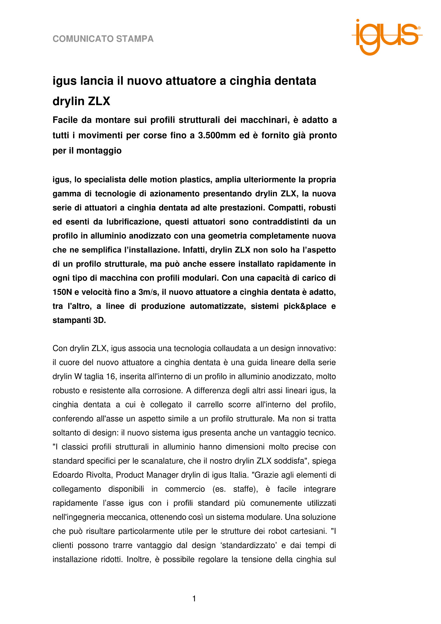 igus, lo specialista delle motion plastics, amplia ulteriormente la propria gamma di tecnologie di azionamento presentando drylin ZLX, la nuova serie di attuatori a cinghia dentata ad alte prestazioni. Compatti, robusti ed esenti da lubrificazione, questi attuatori sono contraddistinti da un profilo in alluminio anodizzato con una geometria completamente nuova che ne semplifica l’installazione. Infatti, drylin ZLX non solo ha l’aspetto di un profilo strutturale, ma può anche essere installato rapidamente in ogni tipo di macchina con profili modulari. Con una capacità di carico di 150N e velocità fino a 3m/s, il nuovo attuatore a cinghia dentata è adatto, tra l’altro, a linee di produzione automatizzate, sistemi pick&place e stampanti 3D.