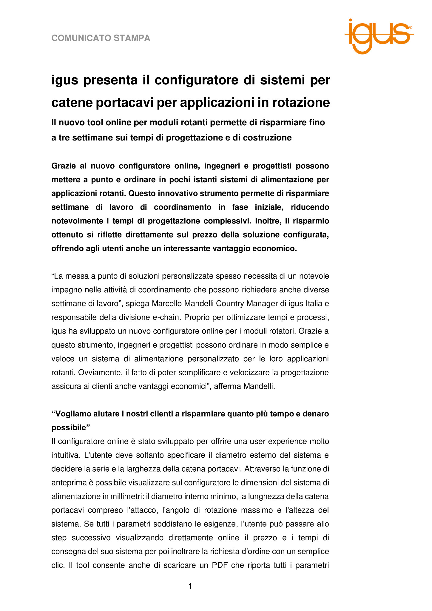“La messa a punto di soluzioni personalizzate spesso necessita di un notevole impegno nelle attività di coordinamento che possono richiedere anche diverse settimane di lavoro”, spiega Marcello Mandelli Country Manager di igus Italia e responsabile della divisione e-chain. Proprio per ottimizzare tempi e processi, igus ha sviluppato un nuovo configuratore online per i moduli rotatori. Grazie a questo strumento, ingegneri e progettisti possono ordinare in modo semplice e veloce un sistema di alimentazione personalizzato per le loro applicazioni rotanti. Ovviamente, il fatto di poter semplificare e velocizzare la progettazione assicura ai clienti anche vantaggi economici”, afferma Mandelli.