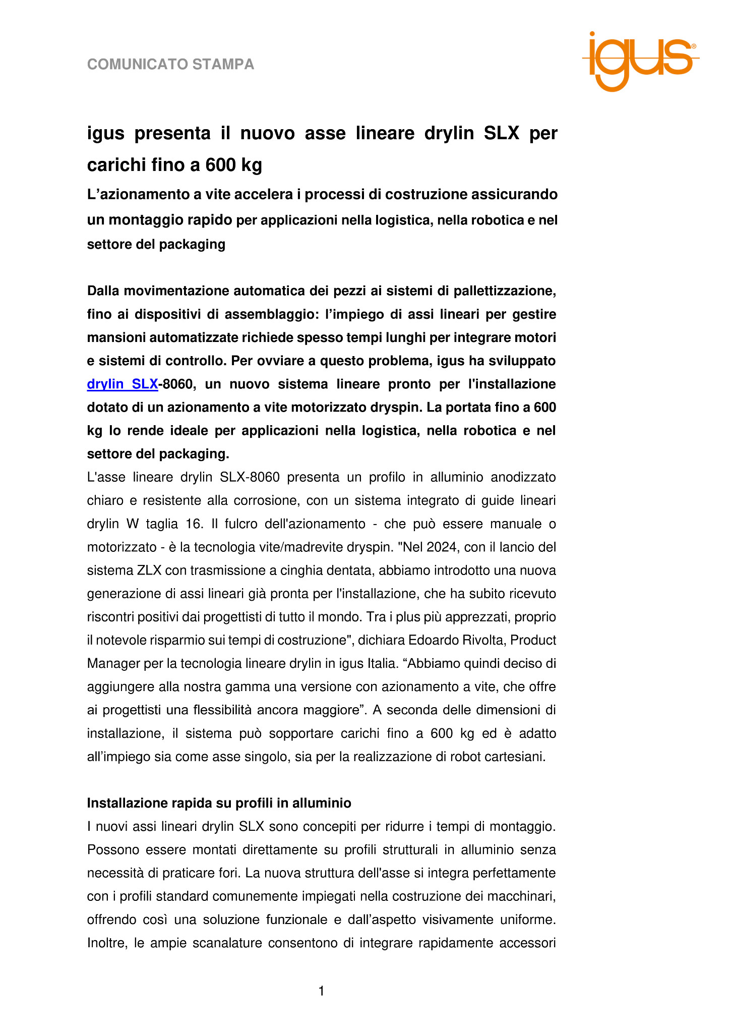 Dalla movimentazione automatica dei pezzi ai sistemi di pallettizzazione, fino ai dispositivi di assemblaggio: l’impiego di assi lineari per gestire mansioni automatizzate richiede spesso tempi lunghi per integrare motori e sistemi di controllo. Per ovviare a questo problema, igus ha sviluppato drylin SLX-8060, un nuovo sistema lineare pronto per l’installazione dotato di un azionamento a vite motorizzato dryspin. La portata fino a 600 kg lo rende ideale per applicazioni nella logistica, nella robotica e nel settore del packaging.
