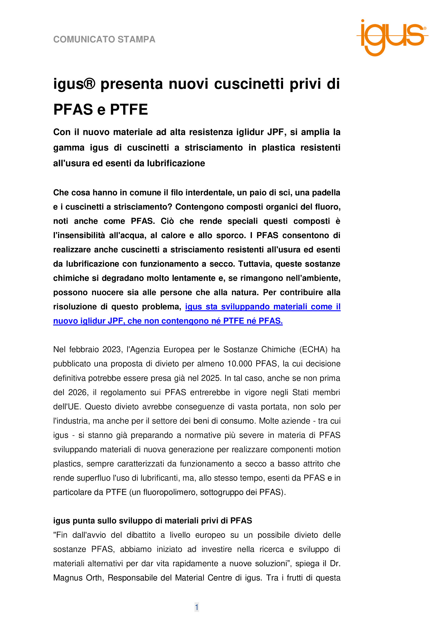 Nel febbraio 2023, l’Agenzia Europea per le Sostanze Chimiche (ECHA) ha pubblicato una proposta di divieto per almeno 10.000 PFAS, la cui decisione definitiva potrebbe essere presa già nel 2025. In tal caso, anche se non prima del 2026, il regolamento sui PFAS entrerebbe in vigore negli Stati membri dell’UE. Questo divieto avrebbe conseguenze di vasta portata, non solo per l’industria, ma anche per il settore dei beni di consumo. Molte aziende – tra cui igus – si stanno già preparando a normative più severe in materia di PFAS sviluppando materiali di nuova generazione per realizzare componenti motion plastics, sempre caratterizzati da funzionamento a secco a basso attrito che rende superfluo l’uso di lubrificanti, ma, allo stesso tempo, esenti da PFAS e in particolare da PTFE (un fluoropolimero, sottogruppo dei PFAS).