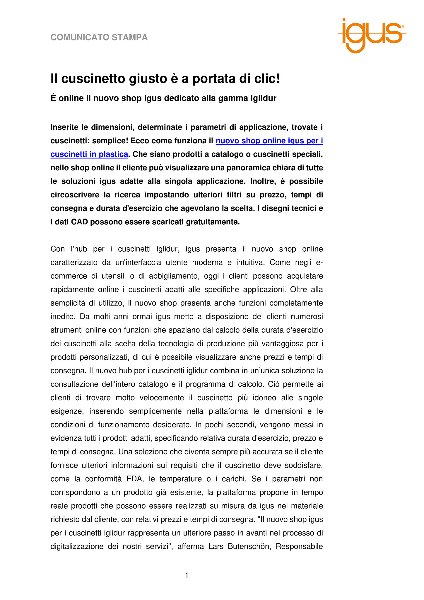 Con l’hub per i cuscinetti iglidur, igus presenta il nuovo shop online caratterizzato da un’interfaccia utente moderna e intuitiva. Come negli e-commerce di utensili o di abbigliamento, oggi i clienti possono acquistare rapidamente online i cuscinetti adatti alle specifiche applicazioni. Oltre alla semplicità di utilizzo, il nuovo shop presenta anche funzioni completamente inedite. Da molti anni ormai igus mette a disposizione dei clienti numerosi strumenti online con funzioni che spaziano dal calcolo della durata d’esercizio dei cuscinetti alla scelta della tecnologia di produzione più vantaggiosa per i prodotti personalizzati, di cui è possibile visualizzare anche prezzi e tempi di consegna. Il nuovo hub per i cuscinetti iglidur combina in un’unica soluzione la consultazione dell’intero catalogo e il programma di calcolo. Ciò permette ai clienti di trovare molto velocemente il cuscinetto più idoneo alle singole esigenze, inserendo semplicemente nella piattaforma le dimensioni e le condizioni di funzionamento desiderate. In pochi secondi, vengono messi in evidenza tutti i prodotti adatti, specificando relativa durata d’esercizio, prezzo e tempi di consegna. Una selezione che diventa sempre più accurata se il cliente fornisce ulteriori informazioni sui requisiti che il cuscinetto deve soddisfare, come la conformità FDA, le temperature o i carichi. Se i parametri non corrispondono a un prodotto già esistente, la piattaforma propone in tempo reale prodotti che possono essere realizzati su misura da igus nel materiale richiesto dal cliente, con relativi prezzi e tempi di consegna. “Il nuovo shop igus per i cuscinetti iglidur rappresenta un ulteriore passo in avanti nel processo di digitalizzazione dei nostri servizi”, afferma Lars Butenschön, Responsabile Marketing per i Cuscinetti iglidur in igus GmbH. “Un percorso che ha come obiettivo ultimo quello di rendere il processo di approvvigionamento il più semplice ed efficiente possibile per i nostri clienti”.