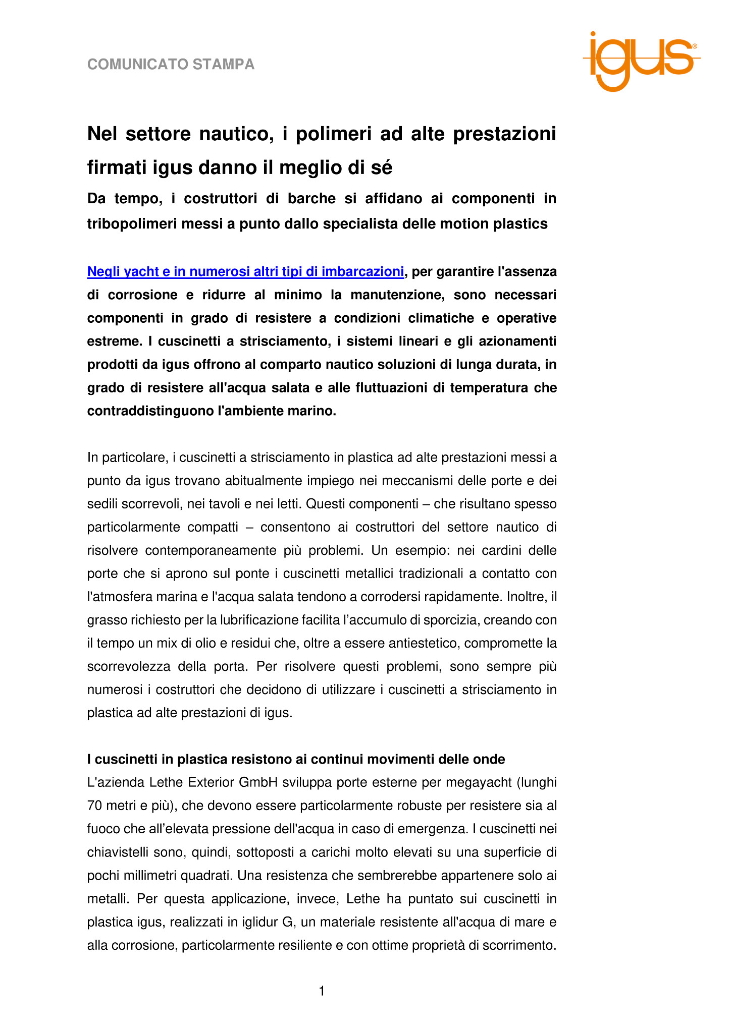 L’azienda Lethe Exterior GmbH sviluppa porte esterne per megayacht (lunghi 70 metri e più), che devono essere particolarmente robuste per resistere sia al fuoco che all’elevata pressione dell’acqua in caso di emergenza. I cuscinetti nei chiavistelli sono, quindi, sottoposti a carichi molto elevati su una superficie di pochi millimetri quadrati. Una resistenza che sembrerebbe appartenere solo ai metalli. Per questa applicazione, invece, Lethe ha puntato sui cuscinetti in plastica igus, realizzati in iglidur G, un materiale resistente all’acqua di mare e alla corrosione, particolarmente resiliente e con ottime proprietà di scorrimento. Anche l’assenza di lubrificazione è un plus essenziale delle soluzioni igus, e non solo per motivi estetici. I lubrificanti solidi incorporati nel polimero vengono rilasciati durante il movimento, garantendo il funzionamento a secco senza necessità di alcuna lubrificazione esterna. “I nostri cuscinetti in plastica non sono solo resistenti all’acqua di mare e durevoli, ma sono anche esenti da manutenzione. Inoltre, contribuiscono alla salvaguardia dell’ambiente, poiché l’acqua e il suolo non vengono inquinati da grassi od oli lubrificanti”, spiega Giulio Ferrante Country Manager di igus Italia. Un altro vantaggio: i cuscinetti a strisciamento in iglidur G fanno parte della gamma di prodotti standard a catalogo, sono quindi disponibili in pronta consegna, assicurando un rapporto prezzo prestazione particolarmente competitivo.