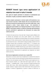 Quest’anno il concorso è alla ricerca di applicazioni di robotica low-cost già in uso, in tutto il mondo, che hanno dimostrato la propria efficienza economica con l’effettivo ritorno del capitale investito (ROI). Possono essere applicazioni con i bracci meccanici robolink, con i delta robot drylin oppure anche con i robot cartesiani – i cosiddetti portali – di igus. Una giuria di esperti provenienti dal mondo della ricerca, della stampa specializzata e dell’industria valuterà i progetti. Audacia e ingegno saranno fattori determinanti nella valutazione del progetto. Il vincitore si aggiudicherà un premio in denaro di 5.000 euro, al secondo classificato andrà un premio di 2.500 euro mentre il terzo posto vincerà un premio di 1.000 euro. Il termine per presentare le candidature è stato fissato al 15 marzo 2020. Le premiazioni si terranno in occasione della fiera automatica 2020 a Monaco, la fiera più importante per l’automazione e la robotica intelligente. I vincitori riceveranno un invito personale per la fiera e non si dovranno preoccupare dell’albergo. Per partecipare, basta fare la registrazione online su: www.igus.it/roibot.