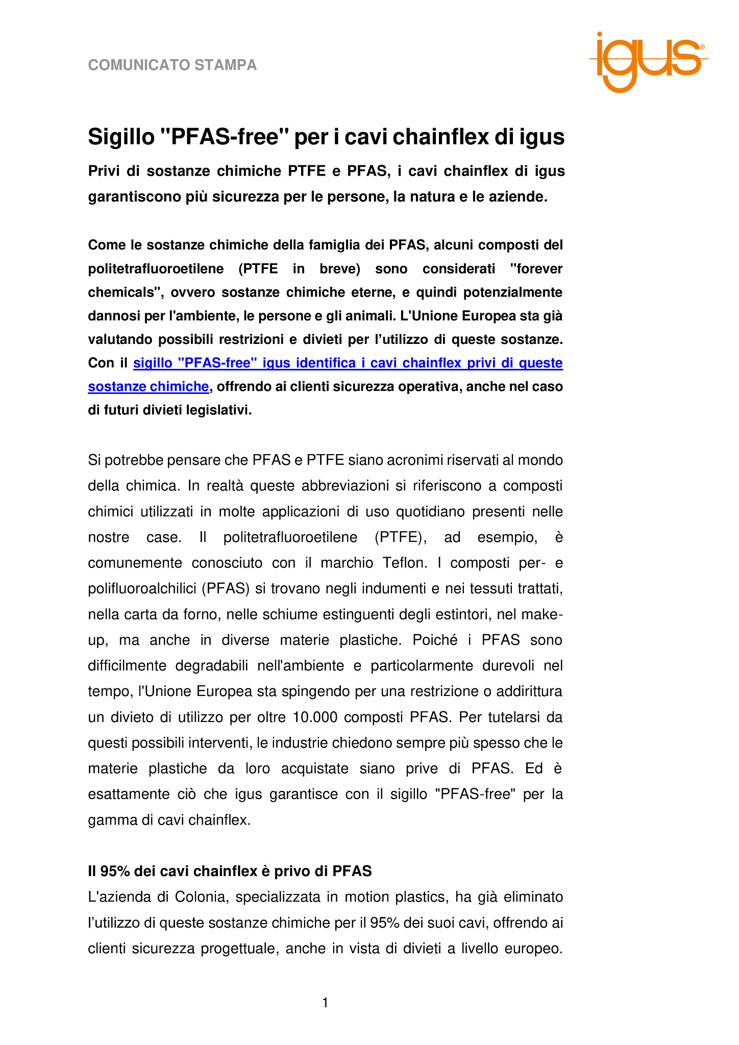 Come le sostanze chimiche della famiglia dei PFAS, alcuni composti del politetrafluoroetilene (PTFE in breve) sono considerati “forever chemicals”, ovvero sostanze chimiche eterne, e quindi potenzialmente dannosi per l’ambiente, le persone e gli animali. L’Unione Europea sta già valutando possibili restrizioni e divieti per l’utilizzo di queste sostanze. Con il sigillo “PFAS-free” igus identifica i cavi chainflex privi di queste sostanze chimiche, offrendo ai clienti sicurezza operativa, anche nel caso di futuri divieti legislativi.